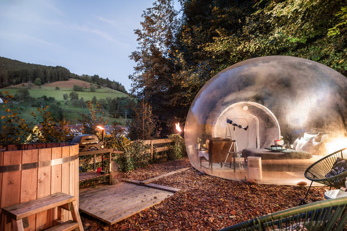 Du erlebst in unserem Bubble-Tent die Nähe zur Natur und kannst die Elzacher Landschaften aus einem komfortablen Wohnraum heraus genießen. Geschützt vor jedem Wetter, mit einem Panoramablick auf die Natur am Tag und die Sterne in der Nacht. Ein Kurztrip um der digitalen Welt zu entfliehen oder für eine romantische Auszeit zu Zweit - Entspannen ohne visuelle Ablenkung.