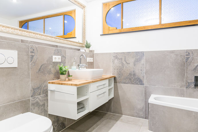 --> Une salle de bain moderne, équipée d’accessoires de haute qualité, d’une baignoire et d’une douche relaxante.
